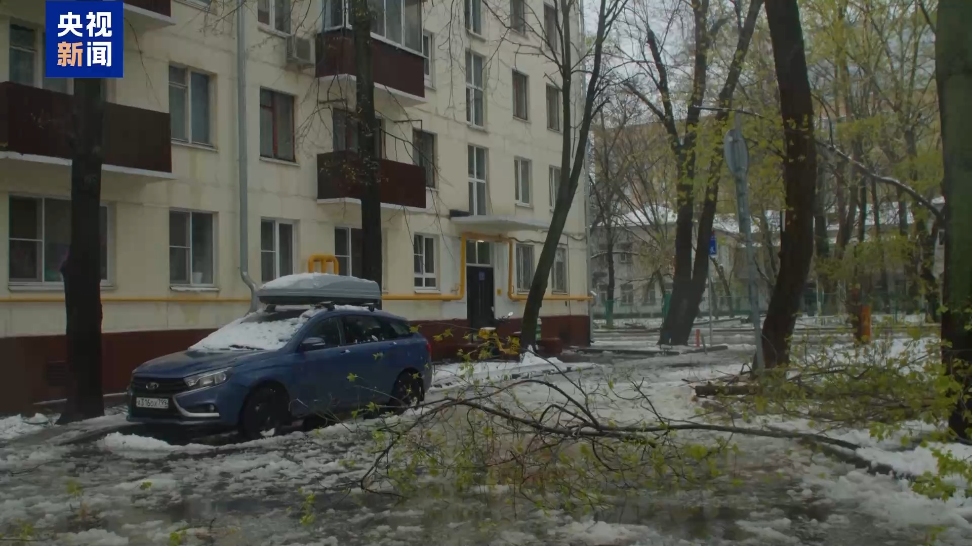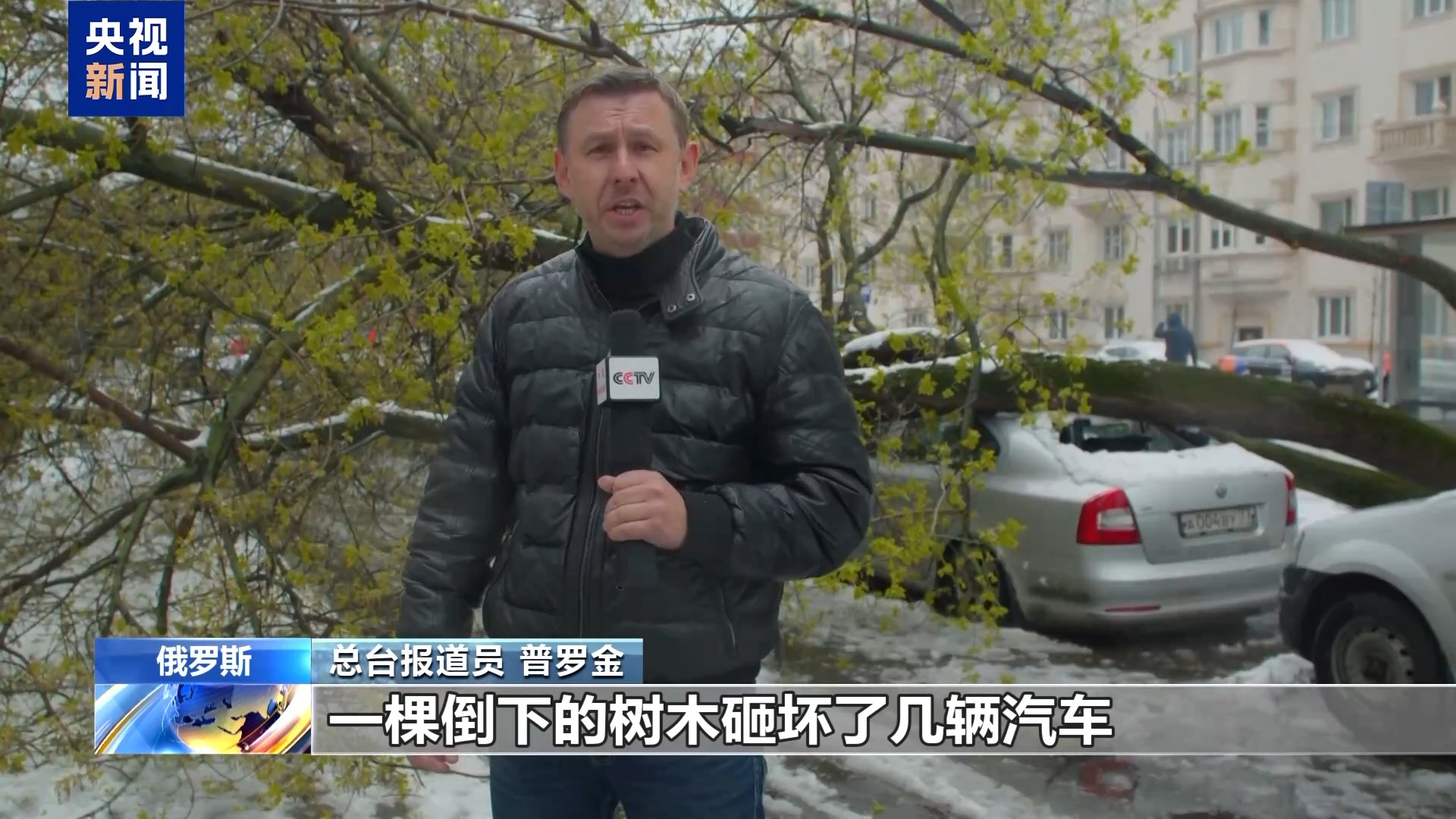 总台报道员 普罗金:这就是风雪肆虐后莫斯科居民区典型的景象,一棵倒下的树木砸坏了几辆汽车,并堵住了通道。